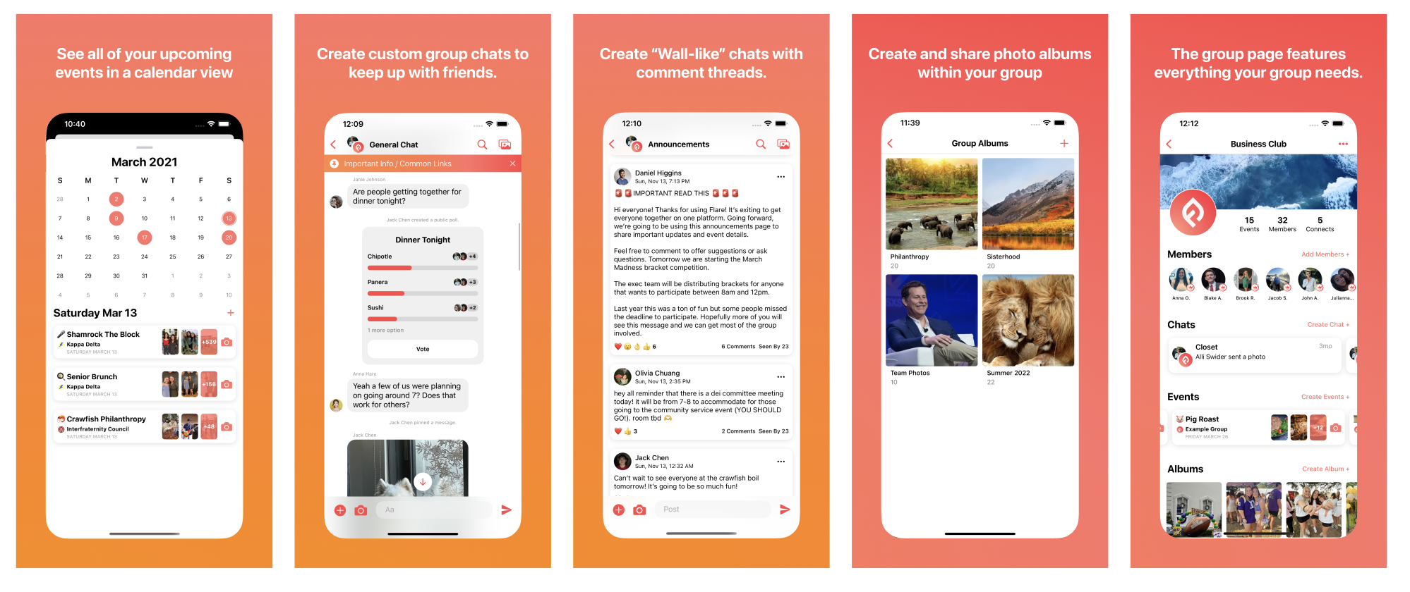 Flare takes the best and most relevant features of apps such as Facebook, GroupMe, PhotoCircle, Calendars, etc. and puts all those features into one place. For example, in Flare, you can create group chats, connect with other chapters, create events on the calendar, and view your friend’s birthdays all without leaving the app.